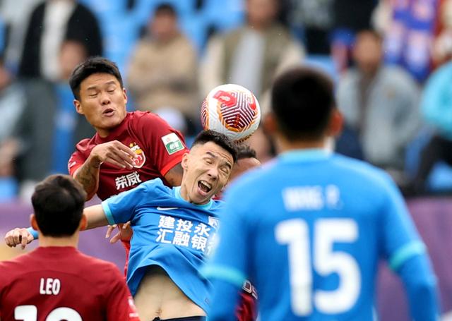 2024年10月27日,上海海港队球员李昂(左上)在比赛中和沧州雄狮队球员刘鑫瑜(右二)争顶。当日,在2024赛季中国足球协会超级联赛第29轮比赛中,沧州雄狮队主场0比1不敌上海海港队。新华社发(周洋摄)
