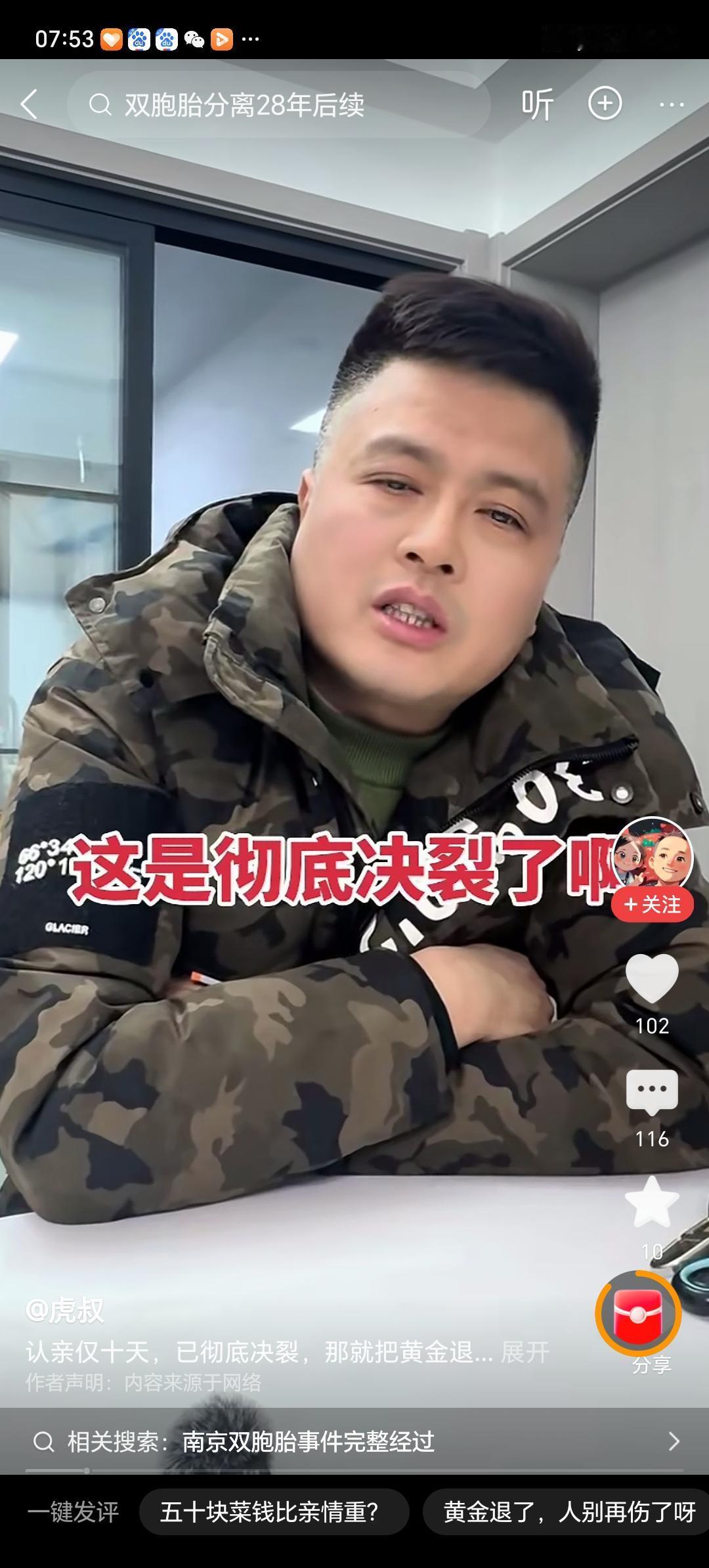 彻底撕破脸了,南京双胞胎认亲事件的弟弟,宣布要起诉哥哥,并且鼓动爸爸妈妈开直播控诉哥哥,结果不到十分钟便被封了! 整个这个事情到现在这个地步,让我感觉这家人既可笑又恐怖,尤其是这个弟弟,他对任何人和任何事都有一种极强的控制欲,必须让别人按照他的欲望去行事,接受他的统治,不然就没完没了,而且会做出非常无理而且没有底线的事情!这明显是惯坏了,而他的父母也在无下限的盲目支持他,不分黑白,颠倒是非!但是他们的一切行为都是徒劳的,熟对孰错,谁善谁恶,大家都能看得清清楚楚!