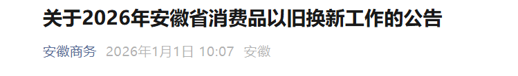 2025年12月31日,安徽省商务厅发布《关于2026年安徽省消费品以旧换新工作的公告》,具体如下: