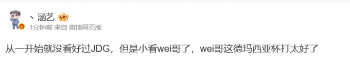 直播吧1月3日讯今日德杯决赛iG连下两局手握三个赛点,赛后涵艺更博:从一开始就没看好过JDG,但是小看wei哥了,wei哥这德玛西亚杯打太好了!
