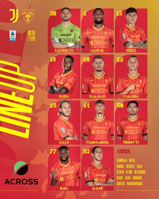莱切首发:30-法尔科内、4-加斯帕、13-佩雷斯、19-班达、10-拉马达尼、22-卡马尔达、25-加洛、44-加布里埃尔、50-皮耶罗蒂、77-卡巴、93-马勒