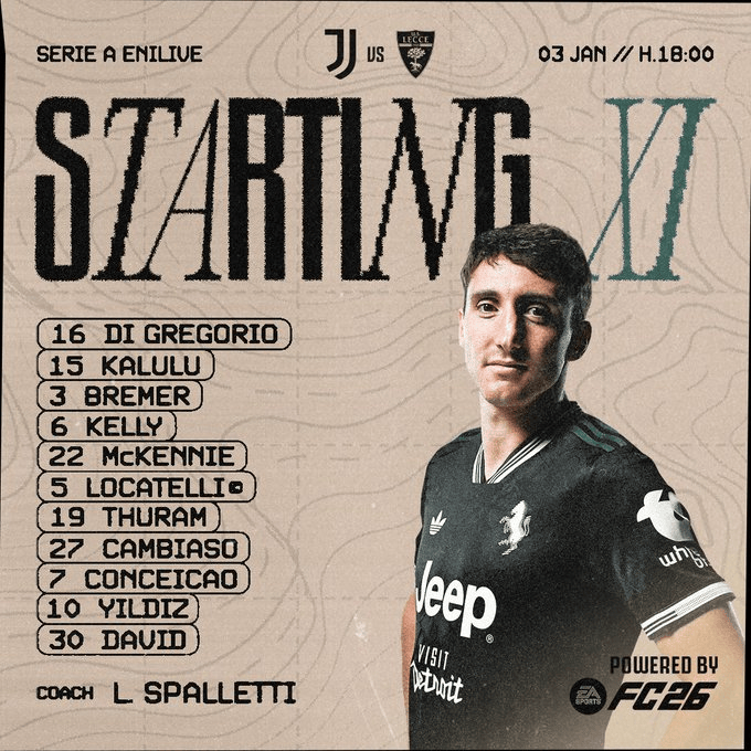 尤文首发:16-迪格雷戈里奥、15-卡卢卢、3-布雷默、6-凯利、22-麦肯尼、5-洛卡特利、19-凯夫伦-图拉姆、27-坎比亚索、7-孔塞桑、10-伊尔迪兹、30-乔纳森-戴维