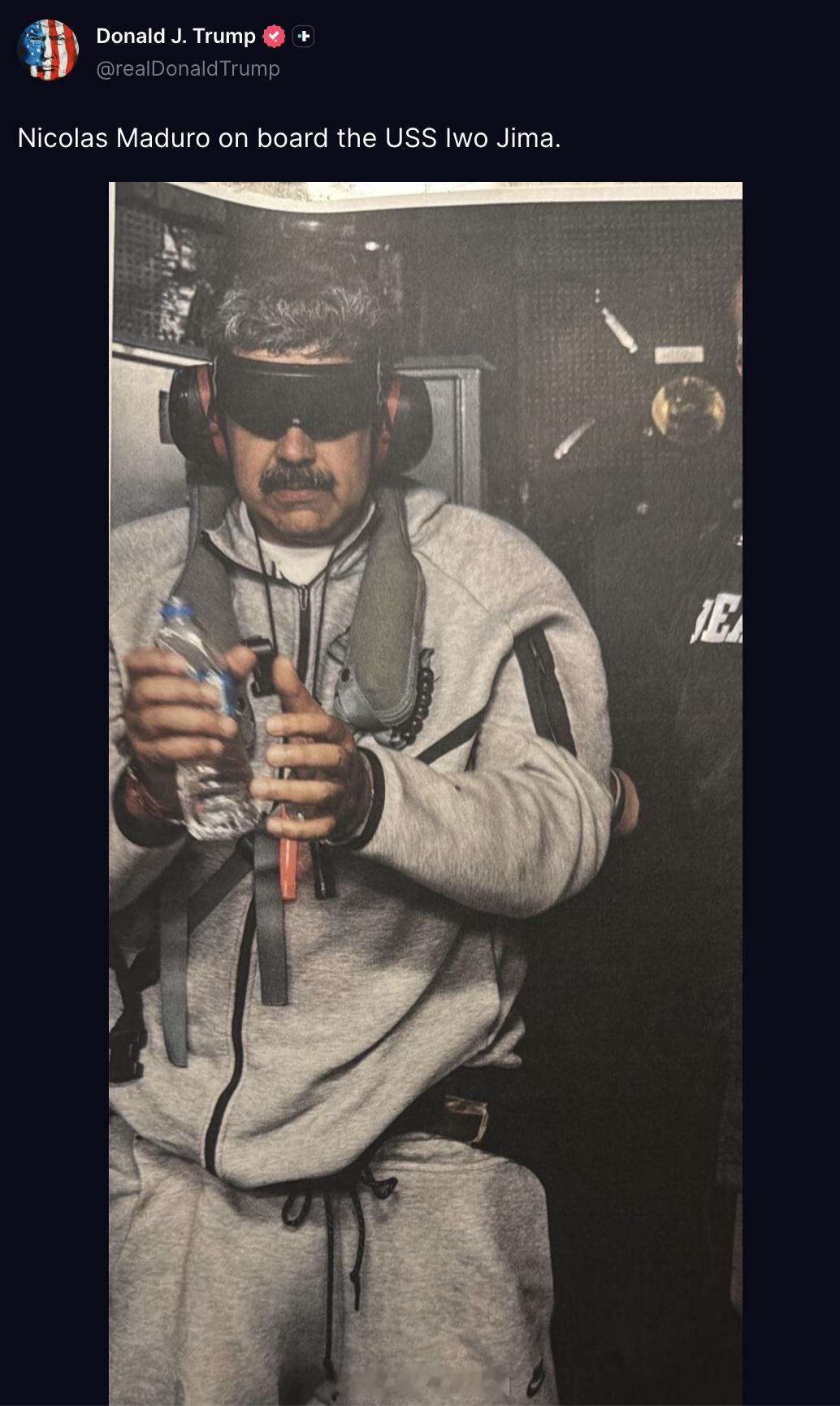 川普放出马杜罗被捕后照片:马杜罗已登上美军“硫磺岛号”。特朗普称已抓获委内瑞拉总