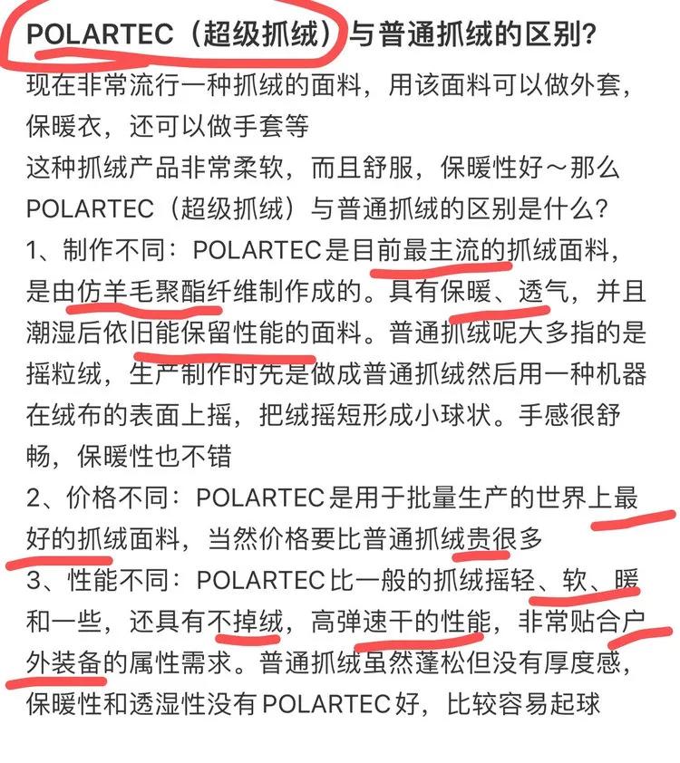 相比普通抓绒,Polartec更暖(锁温效率是普通抓绒的2-3倍)、更透气(运动、出汗也不闷不湿);