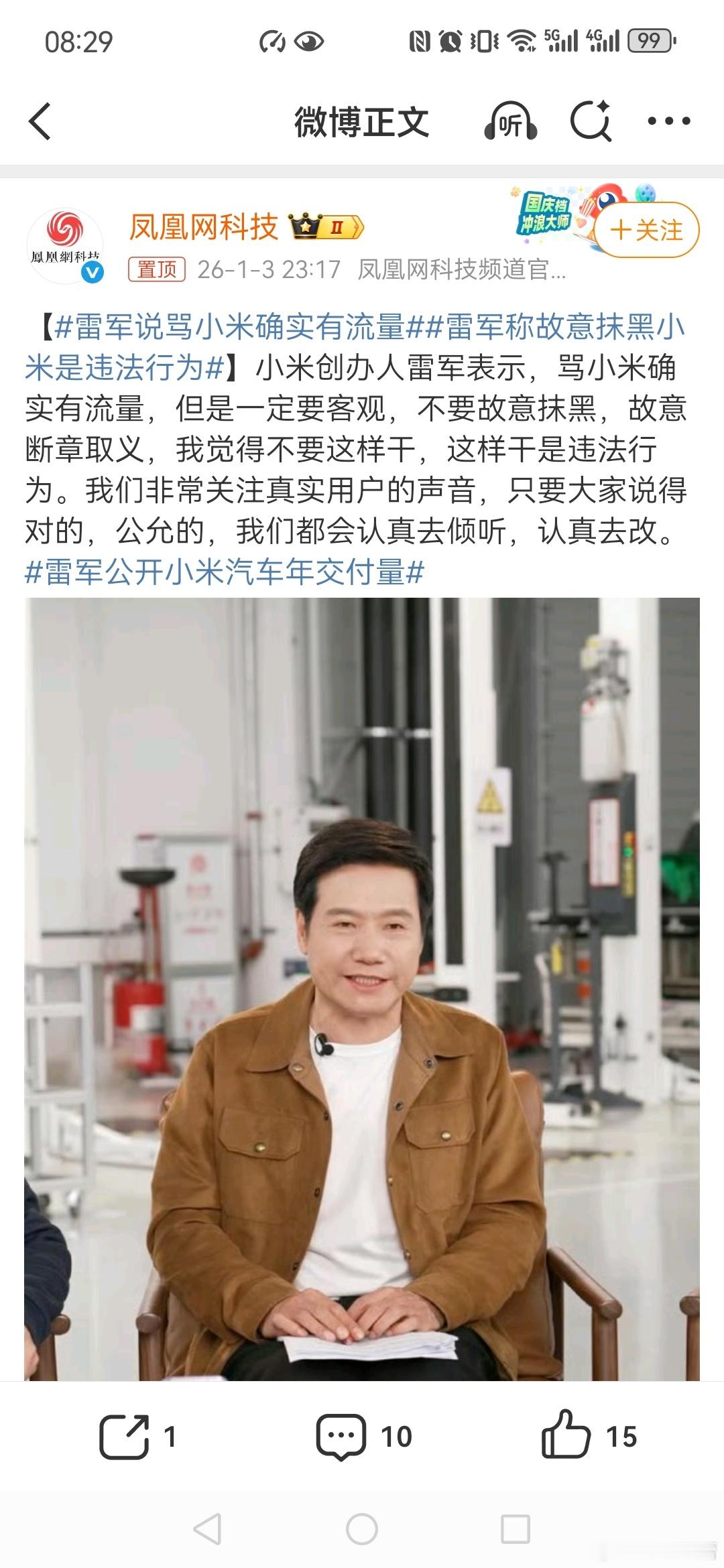 【雷军说骂小米确实有流量雷军称故意抹黑小米是违法行为 雷军公开小米汽车年交付量雷军说的很诚恳,良心企业家,网络不是法外之地,不要为了流量而去骂小米,要看到小米的进步和完善,小米其实一直在努力,不过相较于国外品牌,我们刚起步已经很不错了。相信只要踏实造车十年二十年肯定各种领先。 希望大家说公道话,不要故意找茬,故意摸黑可能会被起诉侵权,承担法律责任。