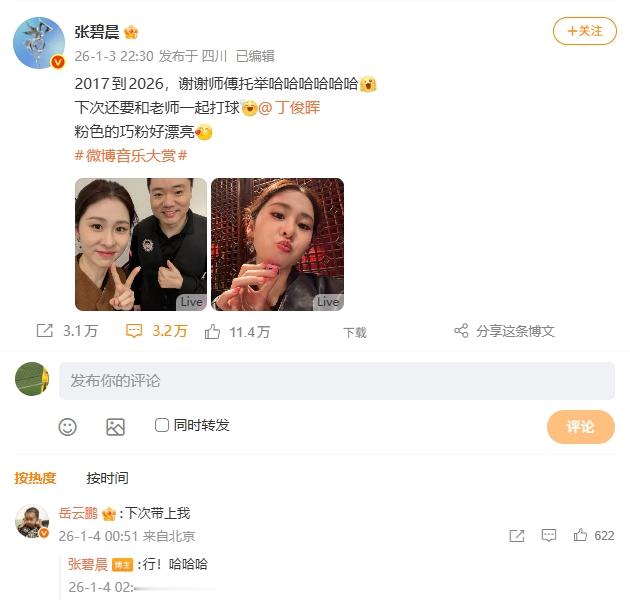 赛后,张碧晨发文晒出和丁俊晖的合照。岳云鹏现身评论区,并表示:“下次带上我”。