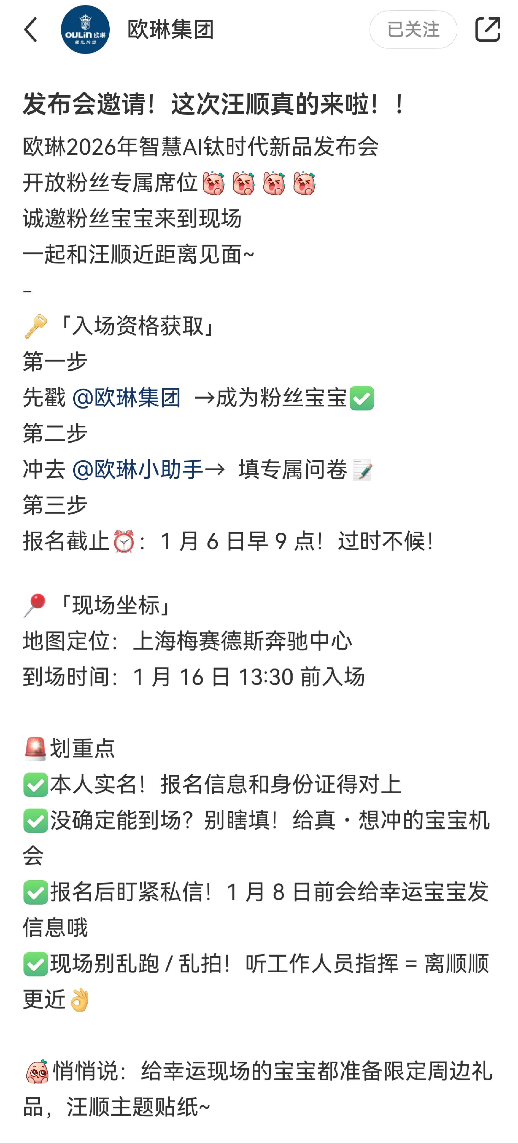 SWim进行时 『9291』20260104 欧琳2026年智慧AI钛时代新品发布会📫活动地点:上海·梅赛德斯奔驰中心⌚活动时间:2026年1月16日14:18🙌参与形式:如图cr🍠欧琳集团汪顺 欧琳品牌代言人