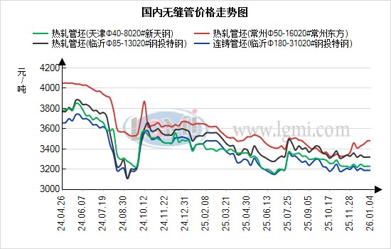 1月4日国内无缝管市场价格整体维持平稳运行。临沂钢投管坯价格今日持稳,当前20#热轧管坯市场报价为3320元/吨。据兰格云商平台监测数据显示,国内重点城市108*4.5规格无缝管均价为4310元/吨,与上个交易日持平;从区域报价来看,重点市场沧州报4010元/吨、上海报4190元/吨、无锡报4200元/吨。值得关注的是,近期南北区域价差呈现小幅波动,沧州与江阴价差为60元/吨,江阴价格偏高;上海与山东价差约70元/吨,上海价格处于高位。