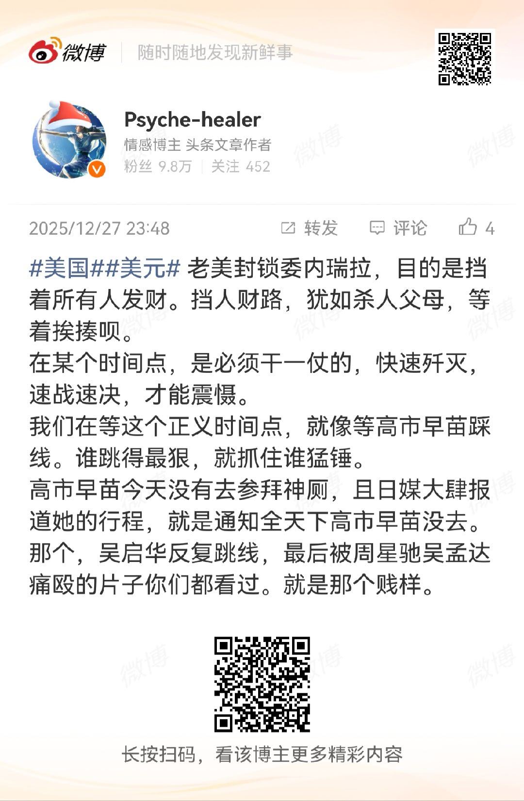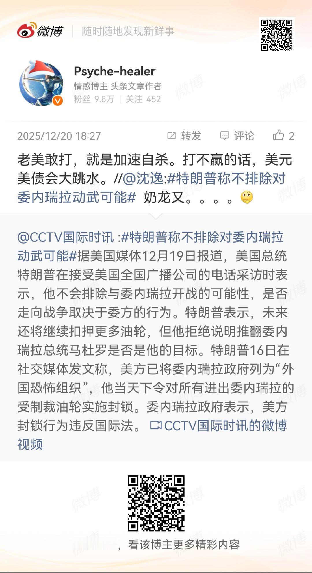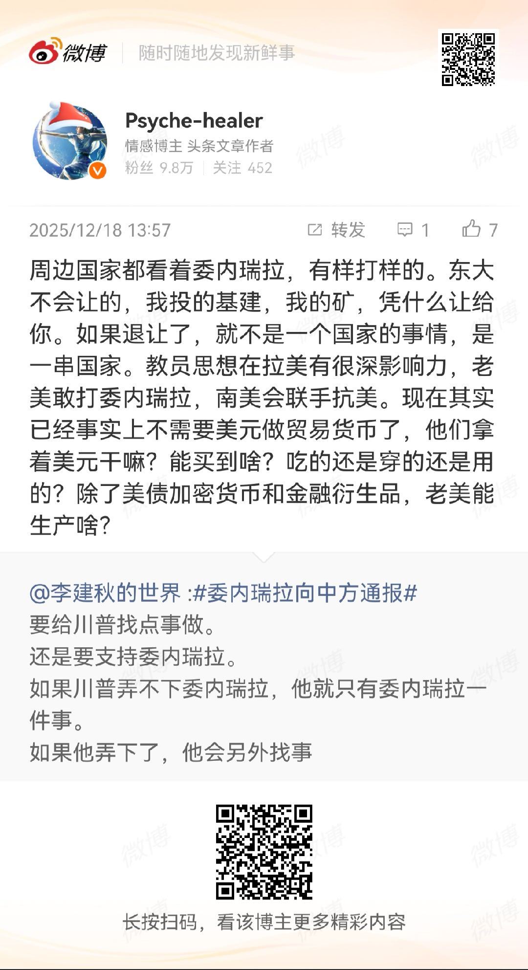 委内瑞拉 为什么美国不打胡赛呢?为什么不打伊朗呢?简单说就是不会下本钱打仗,只会投机,正面战争是不敢打的。川普斩首是为了中期选举、为了他自己家族的生意、为了拯救美元,但是,这么一打,只会加速各国去美元化。这样的强盗,谁敢拿他的货币,脑子不正常的才会买入美元资产,分分钟没收。不管谁上台,建设、做生意是需要钱的,老美给钱吗?不给钱是吧?还想赚钱的话,只能靠贸易。看看谁能买货,表现好点,否则在哪买不是买。以及,不妨再放长时间段看一下,如果⏰不买原油,谁会买,在国际社会,拿着美元有什么用?可以买到什么?如果⏰想让老美崩乱,方法有很多种,但是我们不会这么做,因为乱对我没好处,让他们自己慢慢衰败,稳定地衰败,危害小一些。没错,中必赢。