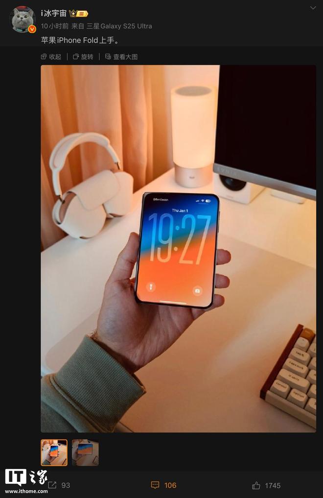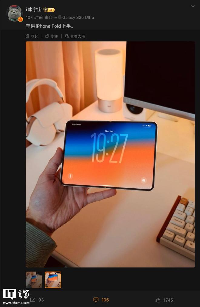 IT之家1月4日消息,博主@i冰宇宙发文,展示了苹果iPhoneFold的“上手”渲染图,显示该机采用独特的阔折叠设计,在展开时形状类似于一台iPad。