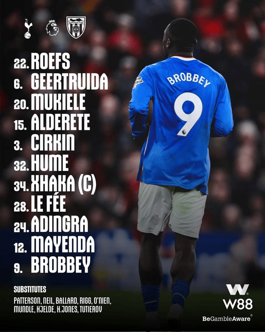 热刺首发:1-维卡里奥、9-里沙利松、11-特尔、14-格雷、17-罗梅罗、20-库杜斯、23-佩德罗-波罗、28-奥多贝尔、30-本坦库尔、33-戴维斯、37-范德芬