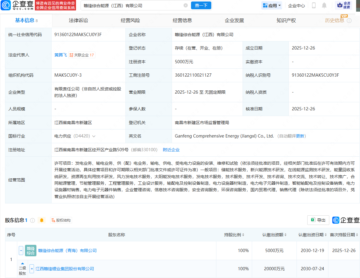 企查查APP显示,近日,赣锋综合能源(江西)有限公司成立,法定代表人为黄腾飞,注册资本为5000万元,经营范围包含:发电业务、输电业务、供(配)电业务;能量回收系统研发;资源再生利用技术研发;风力发电技术服务等。企查查股权穿透显示,该公司由赣锋锂业(002460)间接全资持股。
