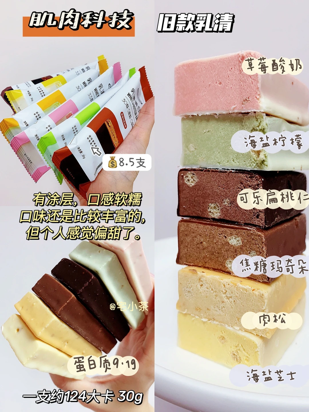 旧版乳清蛋白棒有涂层,口感软糯,会比益生菌的甜一些,但胜在口味多。