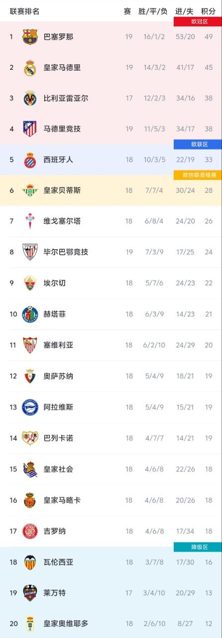 虎扑01月04日讯西甲第18轮的比赛全部结束,积分榜的形势出现新的变化。