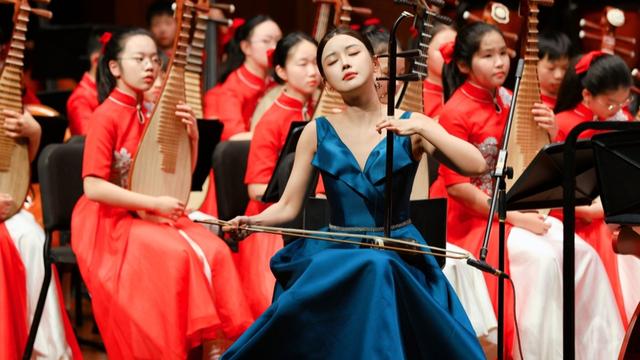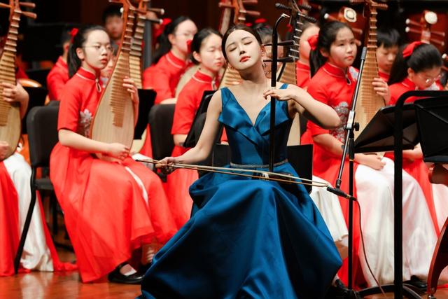 此次音乐会不仅是学生的艺术盛宴,更汇聚了上海音乐学院的专业力量,实现了名家名师与学生的同台共鸣。音乐会高潮环节,二胡演奏家、上音青年教师陆轶文担任二胡独奏,上音民乐系陈晓栋老师执棒指挥,与学校中学民乐团共同演绎经典曲目《洪湖主题随想曲》。在二胡与乐队的深情对话中,洪湖水的波澜壮阔与革命者的赤子柔情被刻画得入木三分,感人至深,让现场观众领略了专业艺术与校园艺术融合的独特魅力。
