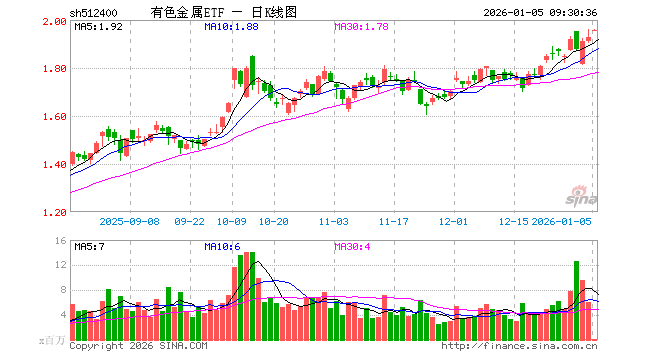 1月5日,有色金属ETF(512400)开盘涨1.50%,报1.956元。有色金属ETF(512400)重仓股方面,紫金矿业开盘涨2.41%,北方稀土涨0.00%,洛阳钼业涨1.00%,华友钴业涨0.88%,山东黄金涨1.91%,赣锋锂业涨1.21%,中国铝业涨4.09%,中金黄金涨2.65%,赤峰黄金涨1.76%,天齐锂业涨0.76%。