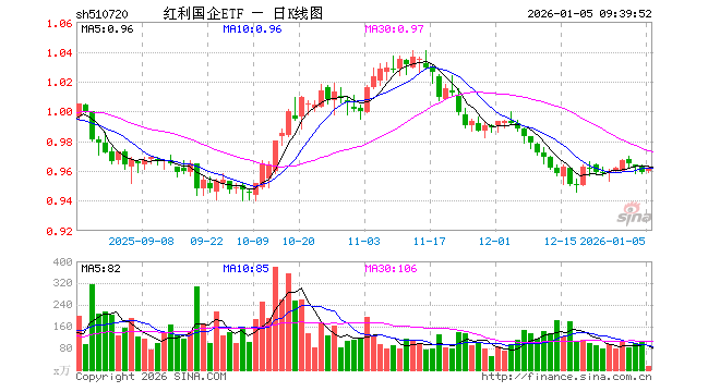 1月5日,红利国企ETF(510720)开盘涨0.10%,报0.960元。红利国企ETF(510720)重仓股方面,中远海控开盘跌0.40%,潞安环能涨0.00%,农业银行跌0.39%,南钢股份涨1.14%,渝农商行跌0.31%,大秦铁路涨0.19%,山煤国际涨0.30%,中国神华涨0.02%,工商银行跌0.25%,江苏金租涨0.00%。