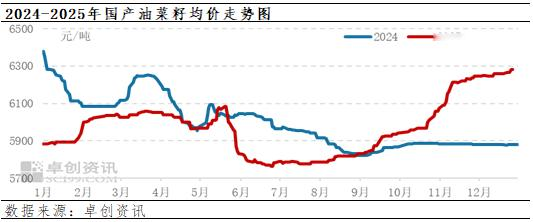 加拿大油菜籽供应依然充足,虽然2025/26年度产量预测数据有所下调,但是依然高于2024/25年度。国内企业暂停采购加拿大油菜籽,下游市场对国产油菜籽需求量呈现增加趋势,支撑国产油菜籽价格连续上涨。据卓创资讯统计,2025年12月份国产油菜籽均价在6255元/吨,较11月份相比上涨1.34%,较2024年12月份相比上涨5.66%。