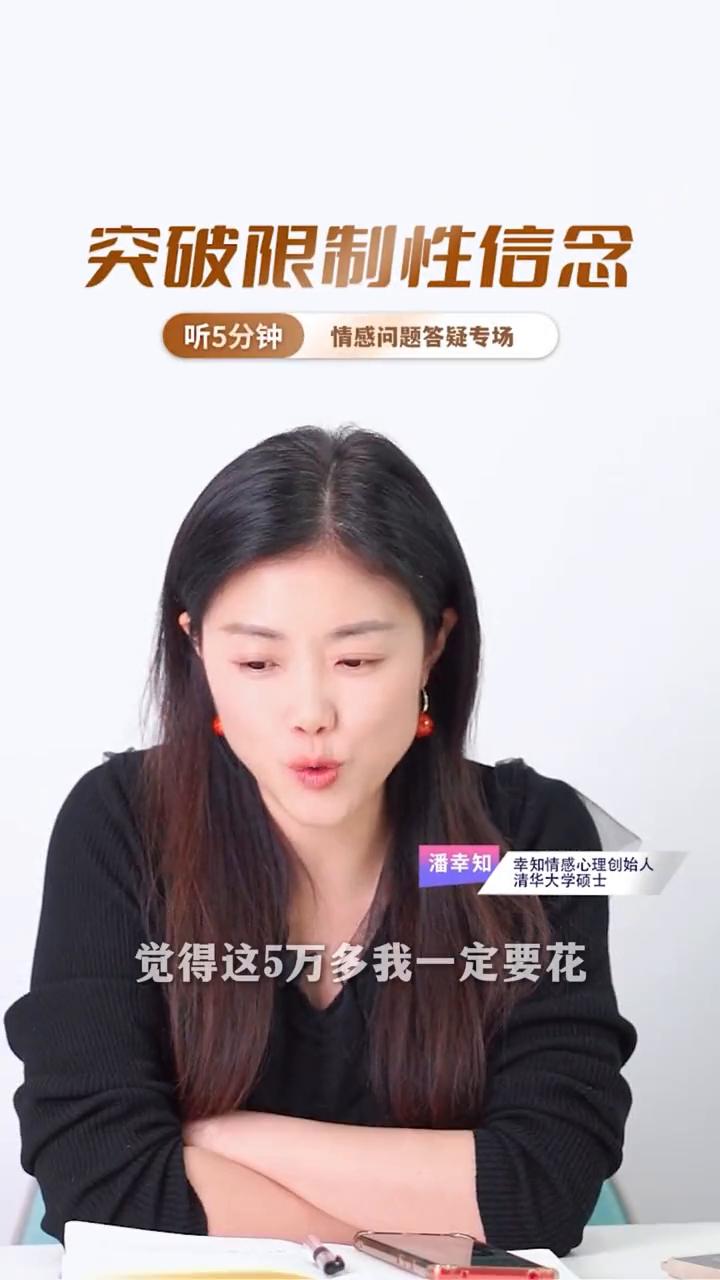 有钱不敢花是怎么回事?突破限制性信念。 幸知情感心理创始人,清华大学硕士潘幸知。 我如何让我的老公改变想法,支持我去花这个5万多块钱。在女性的世界里面允许批准这个词很重要。明明这个事情我自己也有能力去做,我也有财力去做,但我总是很希望得到另一半或者得到一个人的批准允许,我才可以义无反顾的去做。 如果我没有得到另一半的允许批准,我就会带着深深的愧疚和折磨还有内耗,觉得这5万多我一定要花,又觉得我得不到老公的批准,我就很难受。 有情感心理问题,记得私信幸知。