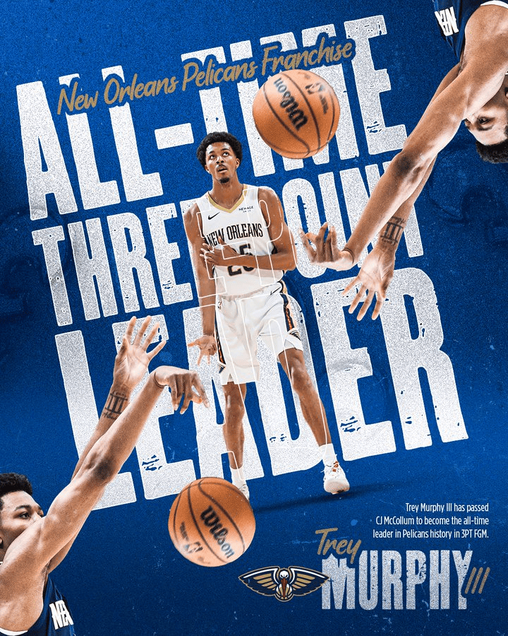 本场比赛后,墨菲鹈鹕生涯共投进696记三分,超越CJ-麦科勒姆,位列队史第一。