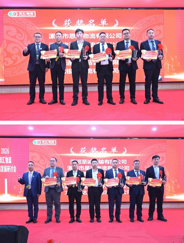 会上,双汇物流颁发了2025年度金牌合作商、优秀合作商、运力先锋奖、特殊贡献奖、合作长青奖五项荣誉奖项,共有45名合作商获得表彰,万通物流、双汇物流高管为获奖者颁奖。