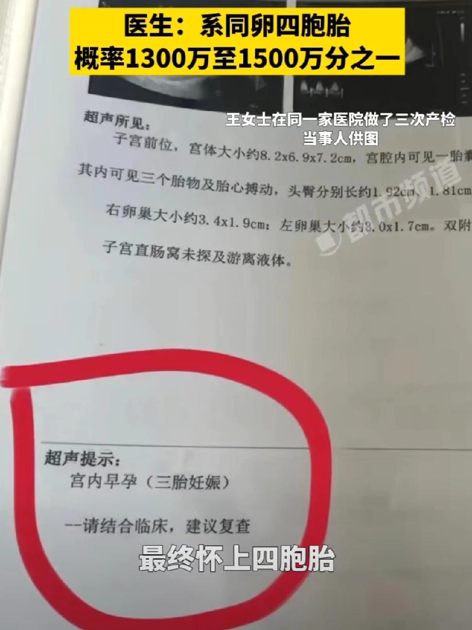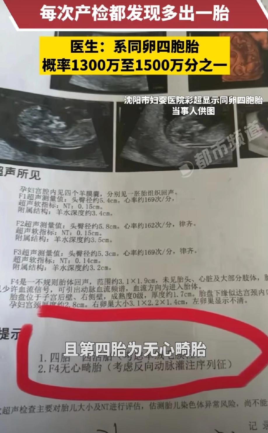 每次产检,彩超单上都会多出一个胎儿? 来自辽宁的王女士怀娃,两个月四次产检,直接从1胎一路涨到4胞胎!直到16周产检尘埃落定,王女士确诊同卵四胞胎。 这概率可是1300万到1500万分之一,虽说其中第四胎是无心畸胎,但医生也明确说了,现在干预手段特别成熟,只要去大医院规范检查治疗就好,不用过度担心! 王女士和丈夫备孕了一段时间,成功怀上宝宝后,夫妻俩都格外开心,小心翼翼地呵护着这份期待。孕早期第一次产检时,彩超显示宫腔内只有一个孕囊,确认是单胎妊娠,王女士和家人都觉得踏实又幸福,开始忙着准备各种新生儿用品。 可没过多久,第二次产检的结果就让王女士吃了一惊。医生通过彩超检查后告知她,孕囊里出现了两个胎心搏动,也就是说,她怀的其实是双胞胎。 这个消息让全家又惊又喜,虽然知道双胎妊娠会更辛苦,但想着能一次拥有两个宝宝,所有的期待都变成了双倍的甜蜜。王女士也开始调整心态,做好了应对双胎孕期的准备。 让她没想到的是,惊喜还在继续。第三次产检时,医生仔细检查后又带来了新消息:胎儿数量又多了一个,变成三胞胎了! 这个结果直接让王女士愣住了,从单胎到双胎再到三胎,短短几周时间,胎儿数量接连翻倍,这种离奇的体验让她既紧张又好奇,忍不住追问医生这到底是怎么回事。 医生解释说,这种情况大概率是同卵多胎,受精卵在发育过程中不断分裂形成的,后续还需要继续观察确认。 带着满心的疑惑和忐忑,王女士迎来了两个月内的第四次产检。这一次,连经验丰富的医生都忍不住感叹神奇——彩超画面里,竟然出现了四个胎儿的影像。 看着报告单上的结果,王女士彻底懵了,从1个到4个,短短两个月的时间,产检单上的胎儿数量一次次刷新认知,这种超出预期的“升级”,让她一时之间不知道该用什么心情来面对。 接下来的日子里,王女士的心一直悬着,既期待最终的确诊结果,又有些担心胎儿的发育情况。随着孕周逐渐增加,胎儿的发育情况越来越清晰,直到孕16周的关键产检,医生结合多次检查数据和详细影像分析,最终确诊王女士怀的是同卵四胞胎。 医生告诉王女士,同卵四胞胎的形成,是由一个受精卵在发育过程中连续三次分裂形成四个胚胎,这种情况极其罕见, 自然受孕的概率仅在1300万到1500万分之一之间,比中彩票头奖的概率还要低得多,她能遇上,绝对是被幸运之神选中的天选妈妈。听到这个结论,王女士和丈夫既激动又觉得不可思议,原本的忐忑也渐渐被期待取代。 不过,产检中也发现了一个特殊情况:四个胎儿中,第四个胎儿是无心畸胎。这个消息让刚刚放松下来的王女士又揪紧了心,连忙向医生咨询情况。 医生看出了她的担忧,耐心解释说,无心畸胎是同卵多胎妊娠中较为特殊的一种情况,表现为胎儿没有心脏结构,会通过胎盘血管从其他正常胎儿身上获取血供和营养,若不及时干预,可能会导致正常胎儿出现贫血、心衰等风险。 但医生紧接着的话让王女士放下了心,现在医学技术已经非常成熟,针对这种情况有明确的干预方案,比如胎儿射频消融术或激光凝固术等,都能精准切断无心畸胎与正常胎儿之间的血液传输,阻断异常供血,最大程度保障正常胎儿的健康发育。 医生建议王女士尽快前往具备相关资质的大型医院,进行规范的检查和后续治疗,只要配合专业诊疗,就不用过度担心。 了解清楚情况后,王女士悬着的一颗心终于落了地。她和丈夫已经做好了规划,准备前往外地的大型医院进行进一步的复检和诊疗。 孕育生命本就是一场充满奇迹的旅程,而王女士的这段特殊孕程,更是把奇迹感拉满。1300万分之一的概率,让她成为了罕见的同卵四胞胎妈妈,虽然过程中出现了小插曲,但成熟的医学技术也为这份奇迹保驾护航。 对此,你们有什么看法,欢迎评论留言~