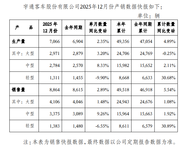 1月5日,宇通客车(600066.SH)发布2025年12月份产销数据快报。根据快报信息,2025年12月公司生产7006辆,同比上涨2.35%;2025年累计生产49356辆,同比上涨4.89%。