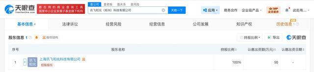 股东信息显示,该公司由科大讯飞旗下上海讯飞和光科技有限公司全资持股。