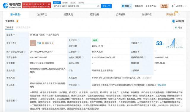 [大河财立方消息]天眼查工商信息显示,近日,讯飞和光(郑州)科技有限公司成立,法定代表人为王鑫,注册资本50万人民币,经营范围含信息技术咨询服务、软件开发、农产品智能物流装备销售、信息系统集成服务、物联网设备销售、智能机器人的研发、人工智能应用软件开发、人工智能基础软件开发、人工智能通用应用系统等。