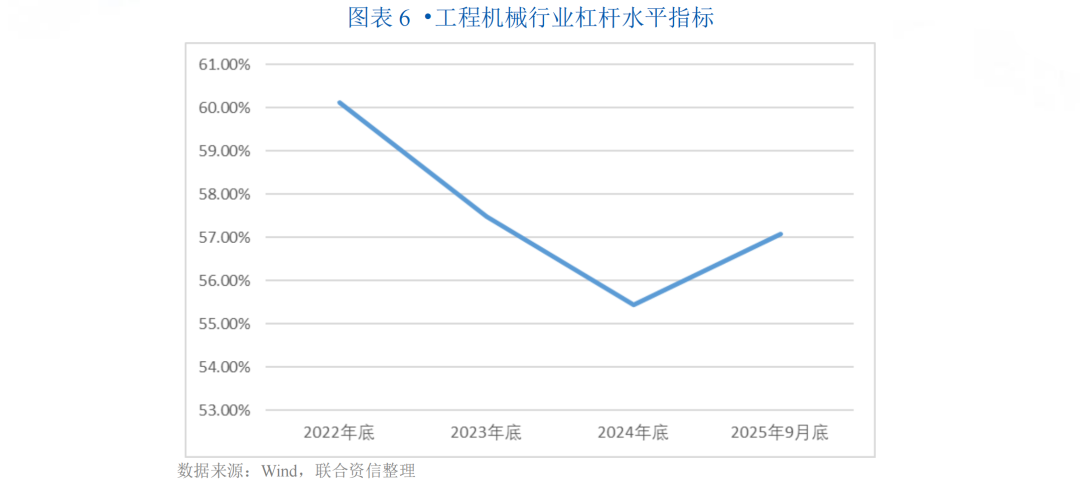 从偿债水平来看,截至2025年9月底,工程机械行业现金类资产/短期债务为0.80倍,现金类资产无法覆盖短期债务,较上年底略有下降;经营现金流动负债比为9.16%,较上年底下降2.68个百分点,主要系经营现金流减少且流动负债增长所致;全部债务/经营活动现金流量净额为7.46倍,较上年底有所增长,经营活动现金流对债务的保障程度下降,整体偿债能力指标均有所弱化。