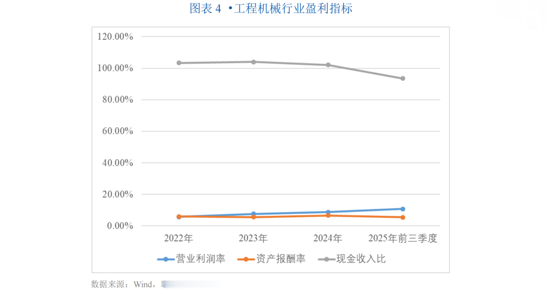 2025年以来,工程机械行业呈现稳健向好的发展态势,整体盈利能力增强,经营活动现金流增长明显,行业资产报酬率保持稳定,现金回收情况总体良好,整体反映出行业增长的积极信号;同时,行业资本支出逐年下降,企业逐步控制投资规模、优化资本配置,或逐渐进入投资回报期。