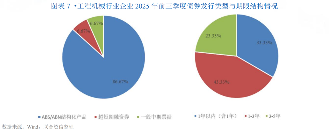 工程机械行业整体发债企业数量少,截至2025年9月底,工程机械行业主要发债企业为3家,分别为徐工机械、中联重科和柳工,存续债券余额合计256.75亿元,债券种类包括中期票据、公司债和ABS/ABN结构化产品,上述发债企业主体信用等级均为AAA,未发生违约、级别下调等情况。当前债券市场数据仅能反映少数头部企业的融资状况,发债企业分析对行业真实融资情况的代表性不足。