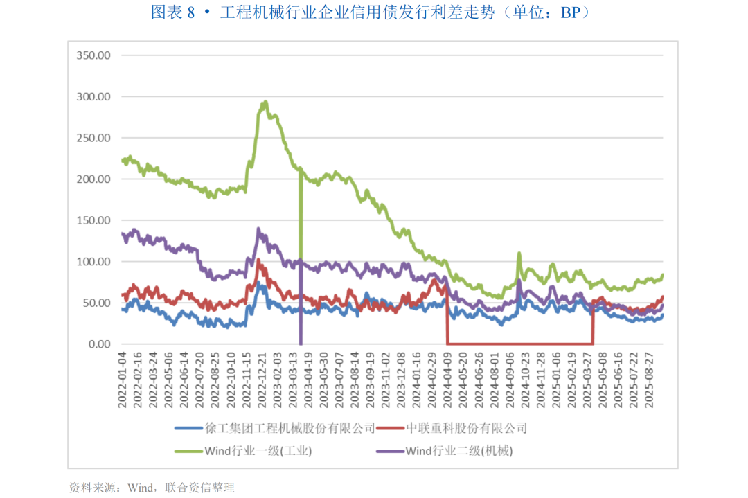 2025年前三季度,工程机械行业企业积极盘活应收账款等存量资产进行融资,发行信用债券规模较上年同期有所增长,发行期限以1~3年为主,行业利差水平较低且走势相对稳定。行业存续债券于2026年到期规模占比较高,存在一定集中偿付压力。