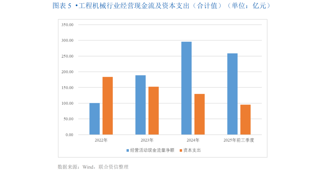 从现金流和资本支出来看,2022-2024年,工程机械行业经营活动现金流量净额(合计值)持续增长,且增幅明显,2025年前三季度,行业经营活动现金净流入同比增长28.37%至258.84亿元,预计2025年全年将保持强劲增长;行业资本支出(合计值)呈逐年下降趋势,反映出企业逐步控制投资规模、优化资本配置,或逐渐进入投资回报期。