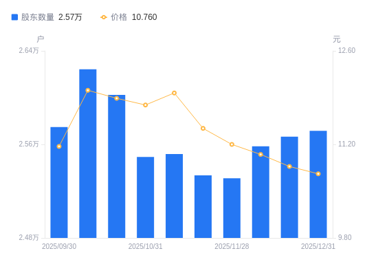 日期A股户数(户)流通A股户均持股数(股)户均持股市值(万元)2025-12-312571640422.9143.502025-12-192566640501.6644.032025-12-102558440631.4744.902025-11-282531141069.7246.002025-11-202533641029.1946.942025-11-102551840736.5648.762025-10-312549240778.1148.082025-10-202602439944.5047.492025-10-102624239612.6747.572025-09-302574940371.1145.09