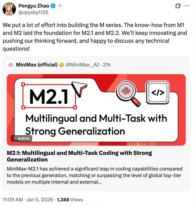 今天,MiniMax开源新模型M2.1,该模型专门针对代理场景优化。赵鹏宇在X上转发官方推文,并称“我们在M系列产品的研发上投入了大量精力。M1和M2的经验为M2.1和M2.2的研发奠定了基础。我们将继续创新,不断突破,并乐于解答任何技术问题!”