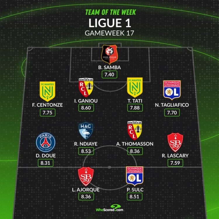 直播吧1月5日讯法甲第17轮联赛已经完赛,whoscored也统计了本轮评分最佳阵容,南特、朗斯、布雷斯特、里昂各2将入围。