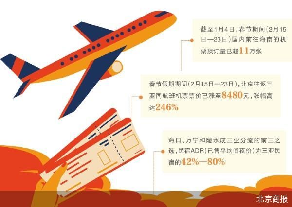 刚刚过去的元旦假期,海南成为境内游热门目的地之一,春节9天假期,更让海南旅游热度持续飙升。1月5日,北京商报记者搜索发现,虽然距离春节假期还有一个多月时间,但海南旅游市场已快速升温,机票、酒店量价齐涨。春节期间北京飞往三亚的机票增幅超过200%。住宿方面,春节假期,一些热门酒店房价较平日上涨约133%。三亚机酒的量价齐涨,也让不少游客开始寻找“平替”,北海、万宁、陵水等地的预订热度也开始上涨。面对春节假期旺盛的出游需求,旅游商家们也积极备战,迎接大客流的到来。