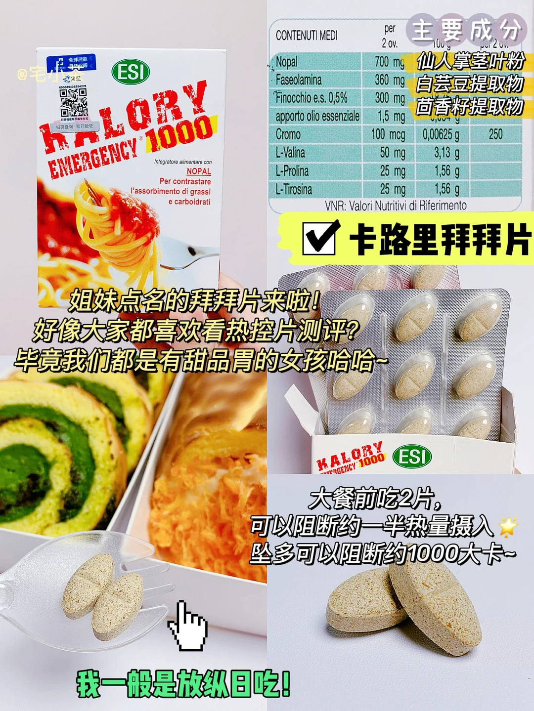 成分主要是梨果仙人掌和白芸豆提取物,大餐前吃2片,可以阻断约一半热量摄入。