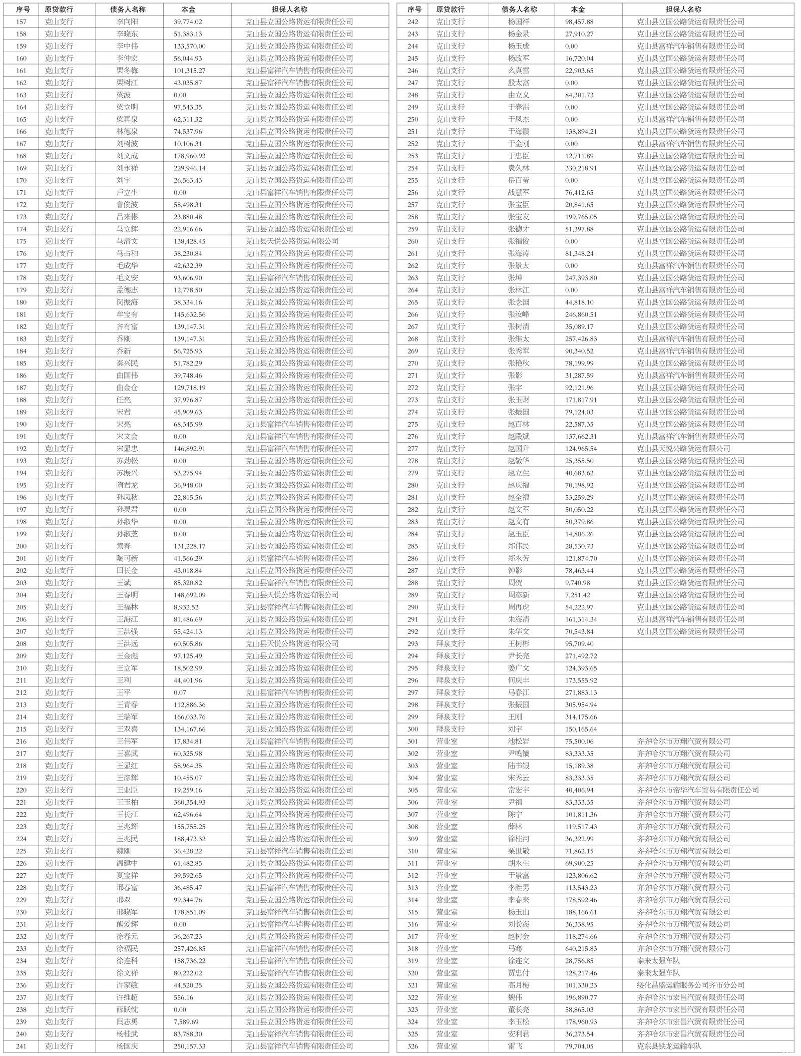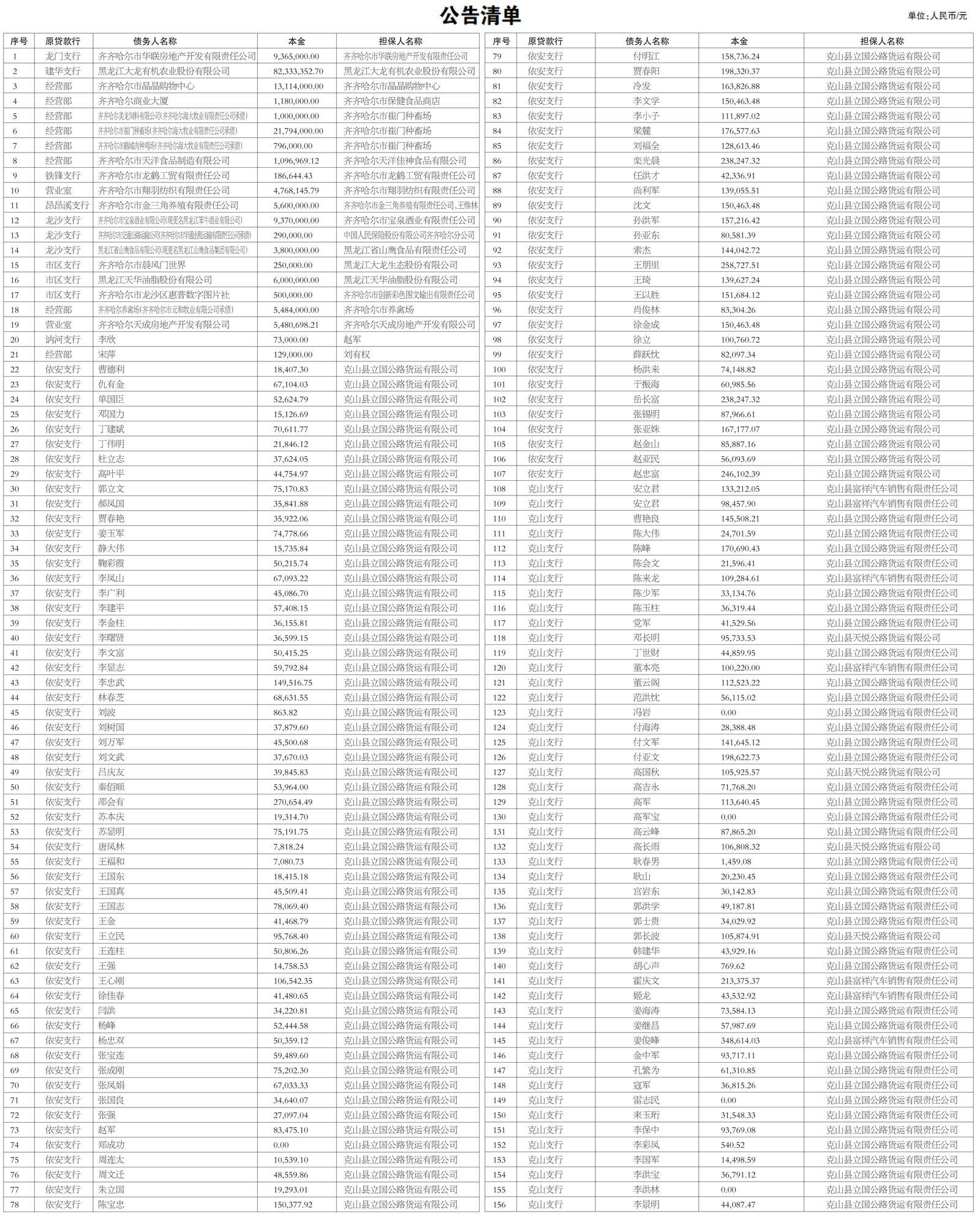 注:本公告清单仅列示截至2025年12月31日的本金余额,借款人和担保人及担保人的承继人应予偿还的利息余额按借款合同、担保合同及中国人民银行的有关规定计算。(单位:人民币/元)