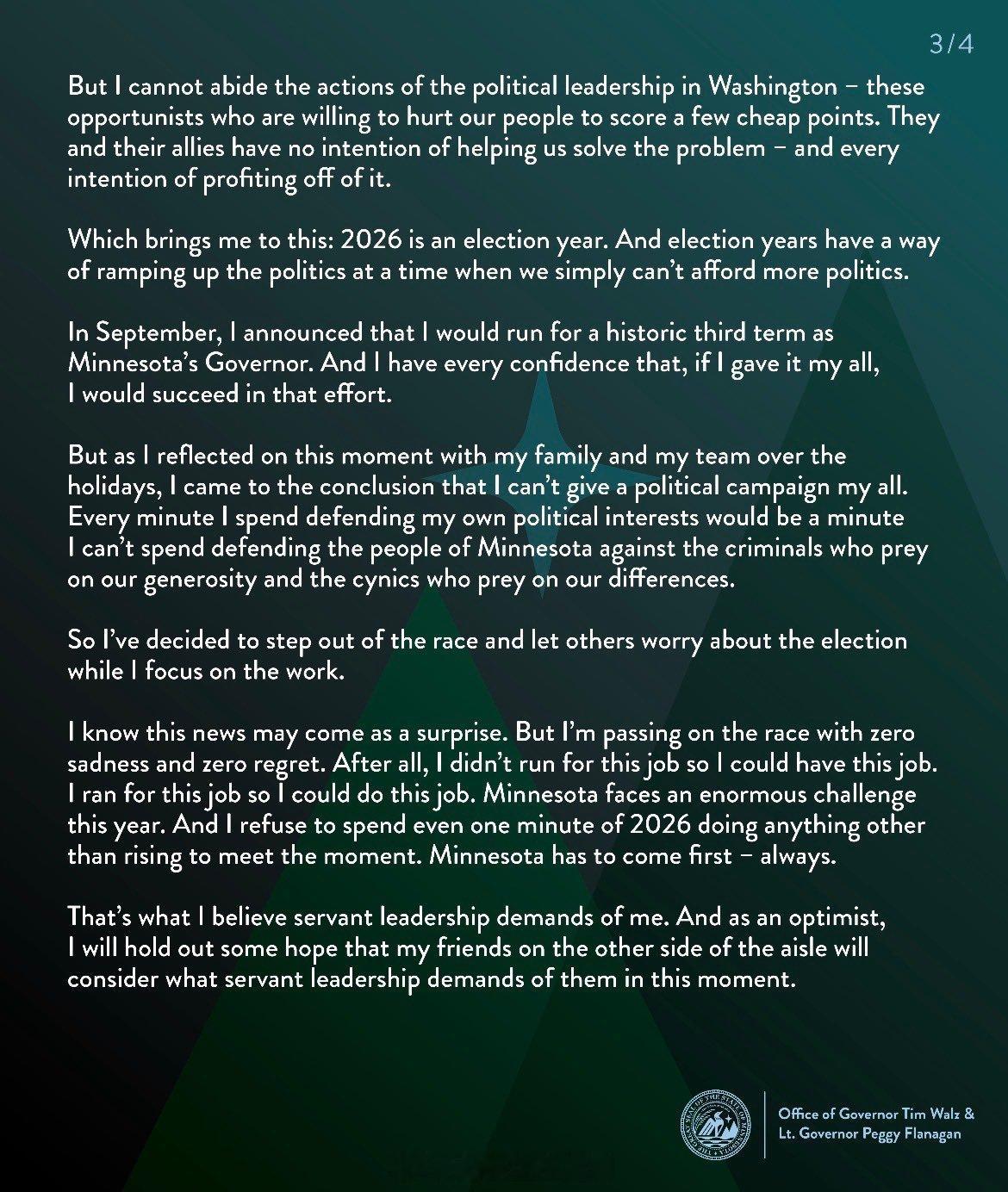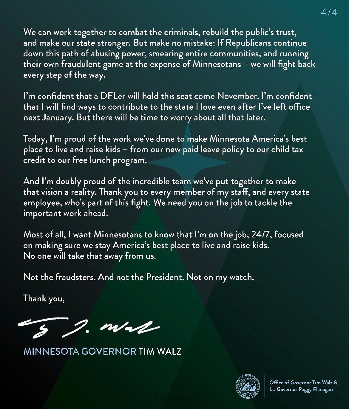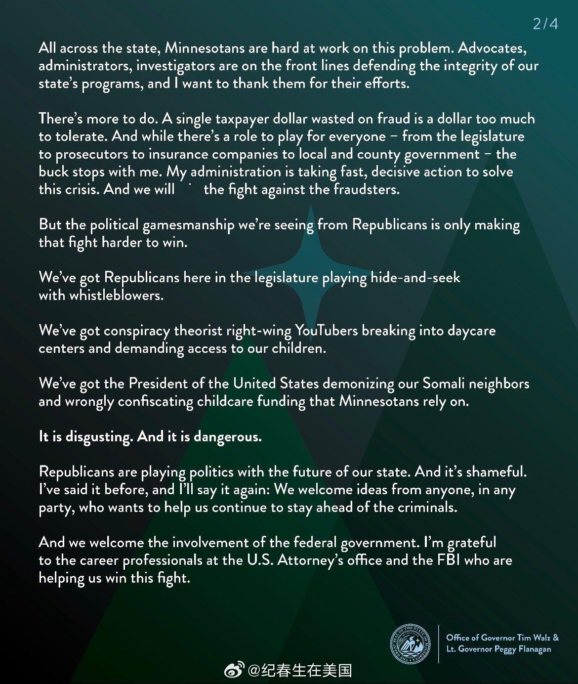 两届明尼苏达州长、前副总统候选人Tim Walz今天宣布,暂停竞选第三个州长任期的连任活动,以便把精力集中在州政府治理上。此举正值明尼苏达州爆发一起规模巨大的欺诈丑闻,涉及托儿、Medicaid以及供餐项目中高达至少90亿美元的资金被滥用。热点现场今日焦点