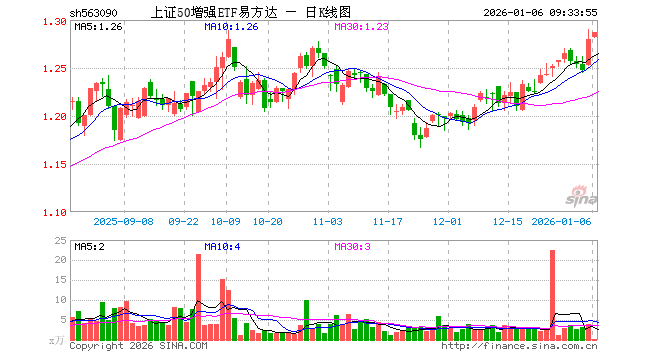1月6日,上证50增强ETF易方达(563090)开盘涨0.16%,报1.282元。上证50增强ETF易方达(563090)重仓股方面,贵州茅台开盘涨0.46%,中国平安涨0.06%,药明康德涨0.59%,海尔智家涨0.15%,深南电路跌1.00%,澜起科技涨0.98%,沪电股份跌1.25%,紫金矿业涨1.69%,豪威集团涨0.11%,国泰海通涨0.29%。