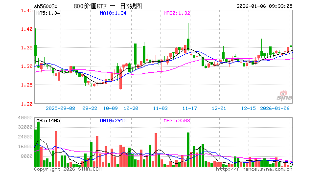 1月6日,800价值ETF(560030)开盘涨0.22%,报1.354元。800价值ETF(560030)重仓股方面,中国平安开盘涨0.06%,招商银行涨0.24%,美的集团跌0.13%,兴业银行涨0.00%,中信证券涨0.10%,工商银行跌0.13%,国泰海通涨0.29%,农业银行涨0.00%,交通银行涨0.14%,格力电器涨0.02%。