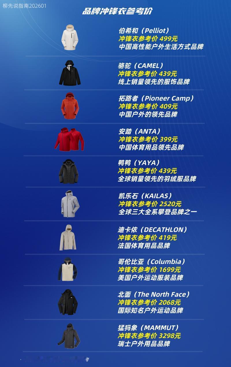 2026年冲锋衣价格 品牌冲锋衣线上参考价 伯希和(499) 骆驼(439) 拓路者(409) 安踏(399) 鸭鸭(439) 凯乐石(2520) 迪卡侬(419) 哥伦比亚(1699) 北面(2068) 猛犸象(3298) 冲锋衣怎么火的? AI来回答:冲锋衣的爆火源于其从专业户外装备向都市时尚单品的成功转型。它凭借防风防水、一衣多穿的强实用性,精准满足了通勤与轻户外需求。而社交媒体种草、明星穿搭示范以及品牌联名,则迅速放大了其流行效应,使其成为兼具功能与风格的时代符号。 冲锋衣 YAYA/鸭鸭春节焕新【冰壳系列5.0PRO】王一博同款三合一冲锋衣90绒