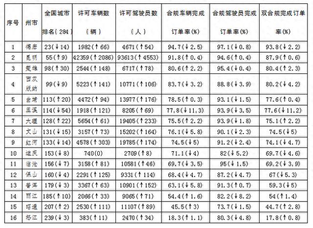 根据全国网络预约出租汽车监管信息交互平台统计,截至2026年1月3日,在内地31个省份网约车合规率排名中,云南排第15位,与上月排名一致;双合规完成订单率为77%,环比下降1.5%,同比上升16.03%,高于各省平均值(67.11%)。全省网约车许可车辆86422辆,增加3517辆;许可驾驶员数248510人,增加6121人。