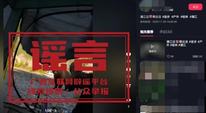 2025年12月8日,桂林市公安局七星分局在网络巡查工作中发现,网民曾某于11月29日晚,通过AI软件生成一段“大黑熊出现在漓江边”的虚假视频,并将该视频发布至某短视频平台。