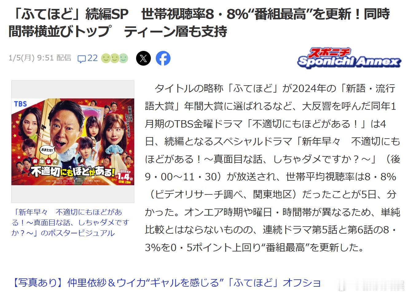 海外影视速递 《不合适也要有个限度!》SP篇于2026年1月4日播出,家庭平均收视率为8.8%。本作品由阿部隆史主演、宫藤官九郎 编剧,是由“昭和时代的废柴大叔”来到了令和时代而展开的穿越喜剧,共演还有吉田羊仲里依纱矶村勇斗河合优实 坂元爱登 江口德子。中学体育教师小川市郎从1986年穿越到2024年的现代。言语粗俗,反复着令和无法想象的“不恰当”言行的市郎却也带给了因合规而被束缚的令和时代的人们思考的契机。