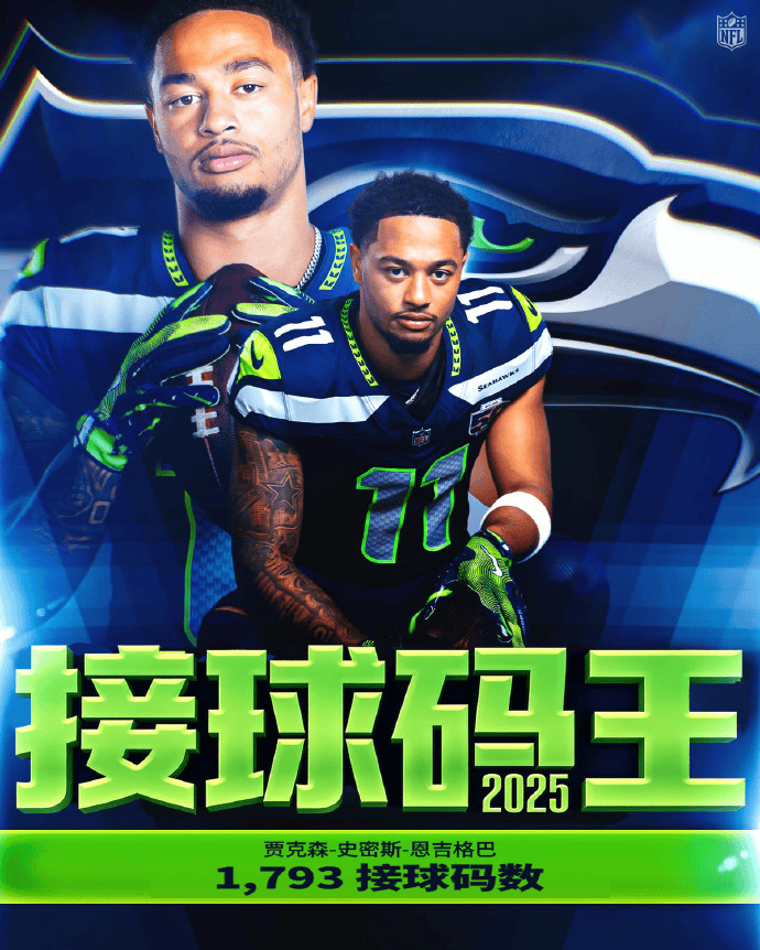 海鹰队的恩吉格巴在接球码数、接球次数与达阵次数上都迎来生涯新高,以1793接球码数获得“2025接球码王”的称号。