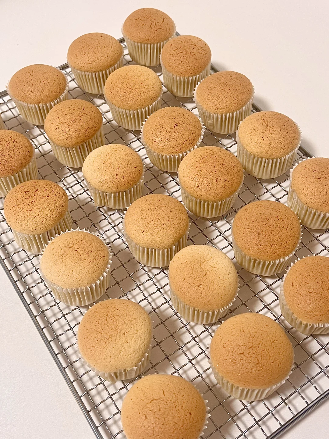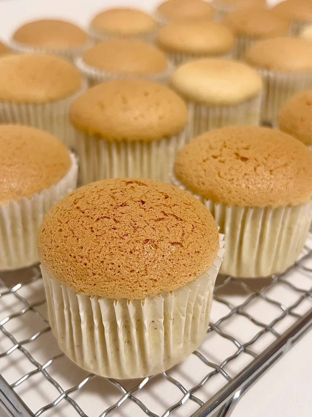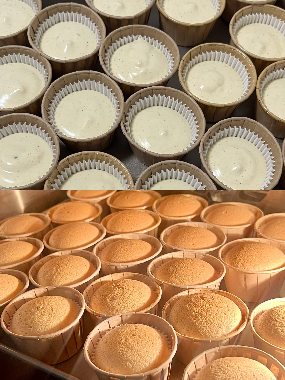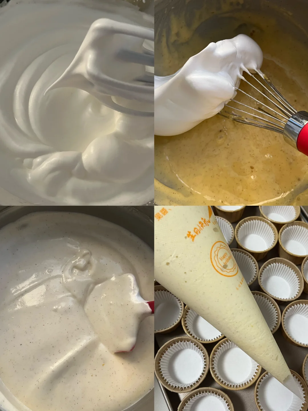 【所需食材】 - 【蛋黄糊部分】 蛋黄6个|玉米油60克|牛奶70克|新良红豆薏仁小米面粉100克 【蛋清部分】 蛋清6个|柠檬汁几滴|细砂糖70克 🖤【制作过程】 1⃣️分离蛋清蛋黄,蛋清冰箱冷藏备用 2⃣️玉米油和牛奶搅拌乳化均匀 3⃣️过筛加入低筋面粉 4⃣️加入蛋黄搅拌均匀 5⃣️蛋清加几滴柠檬汁和细砂糖,打发蛋清至提起打蛋器呈现小弯钩 6⃣️蛋清和蛋黄糊分两次翻拌均匀,混合好的面糊倒入纸杯模具中,轻震模具去除部分气泡 7⃣放入预热好的烤箱,烘烤参考温度:140度60分钟
