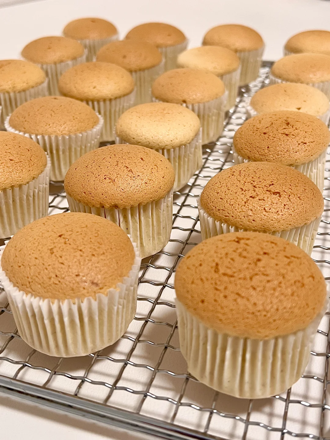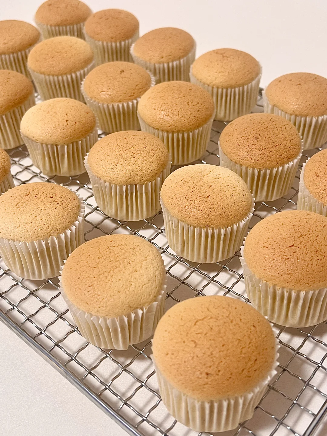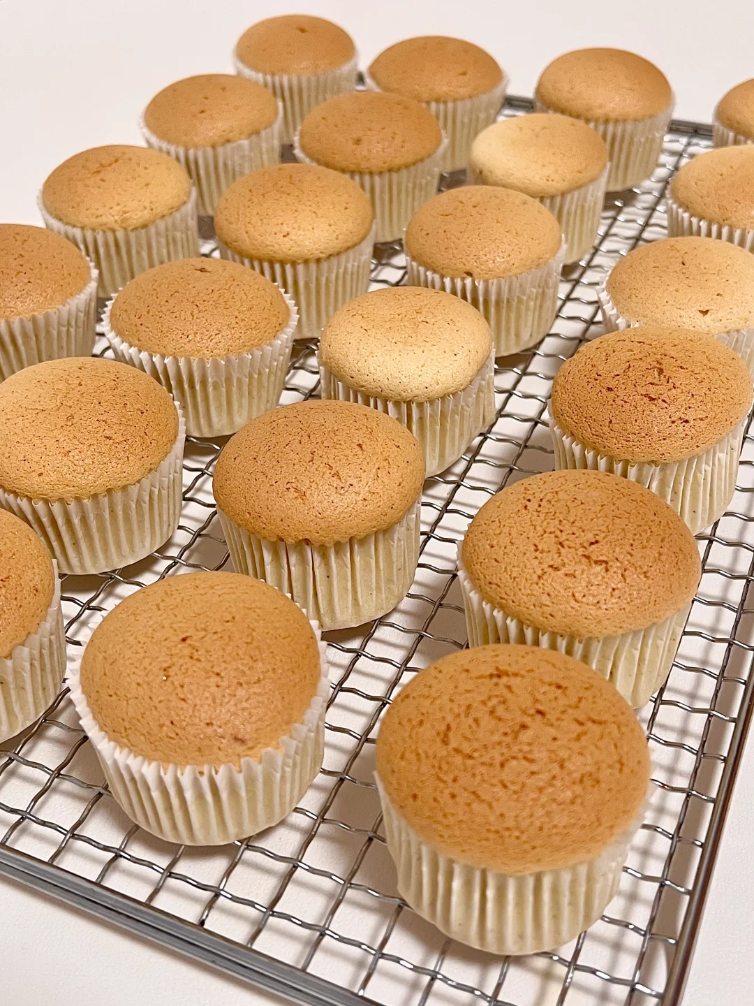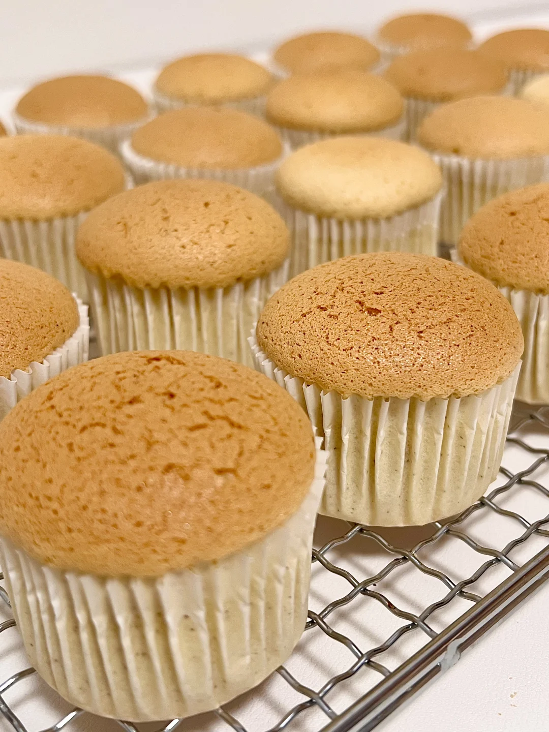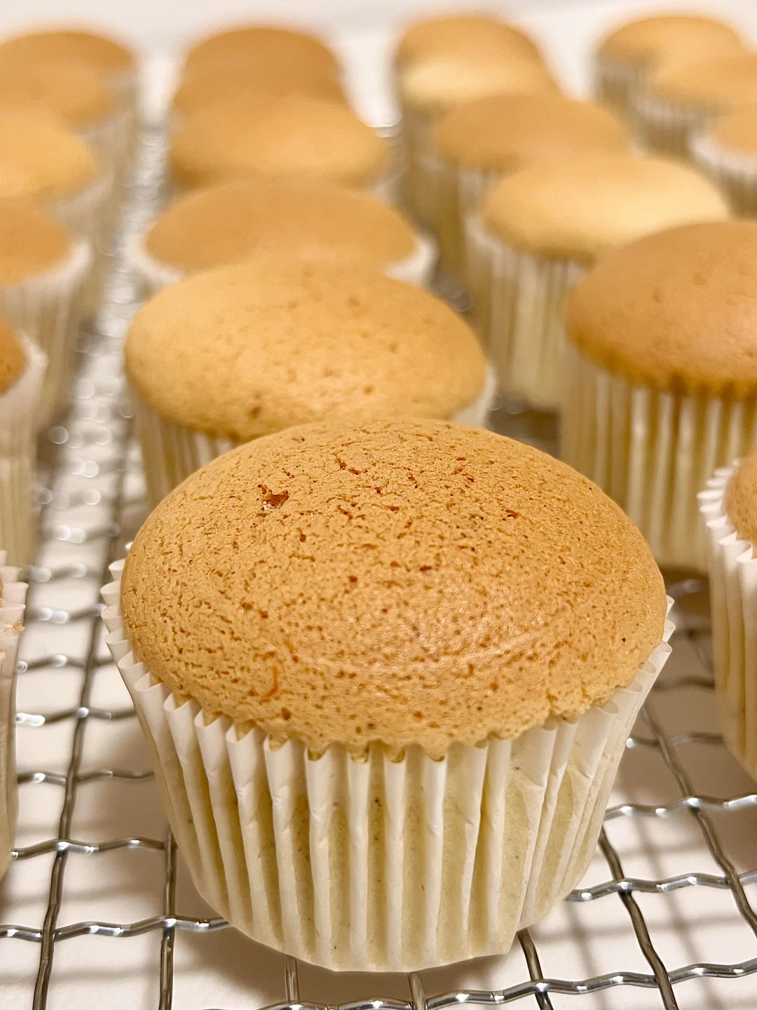 【所需食材】 - 【蛋黄糊部分】 蛋黄6个|玉米油60克|牛奶70克|新良红豆薏仁小米面粉100克 【蛋清部分】 蛋清6个|柠檬汁几滴|细砂糖70克 🖤【制作过程】 1⃣️分离蛋清蛋黄,蛋清冰箱冷藏备用 2⃣️玉米油和牛奶搅拌乳化均匀 3⃣️过筛加入低筋面粉 4⃣️加入蛋黄搅拌均匀 5⃣️蛋清加几滴柠檬汁和细砂糖,打发蛋清至提起打蛋器呈现小弯钩 6⃣️蛋清和蛋黄糊分两次翻拌均匀,混合好的面糊倒入纸杯模具中,轻震模具去除部分气泡 7⃣放入预热好的烤箱,烘烤参考温度:140度60分钟